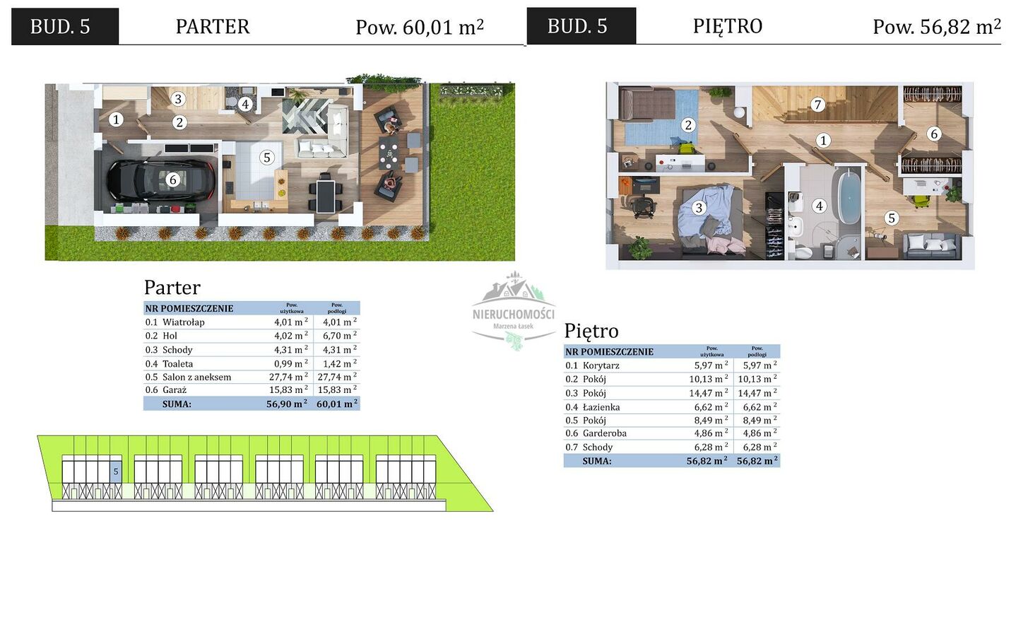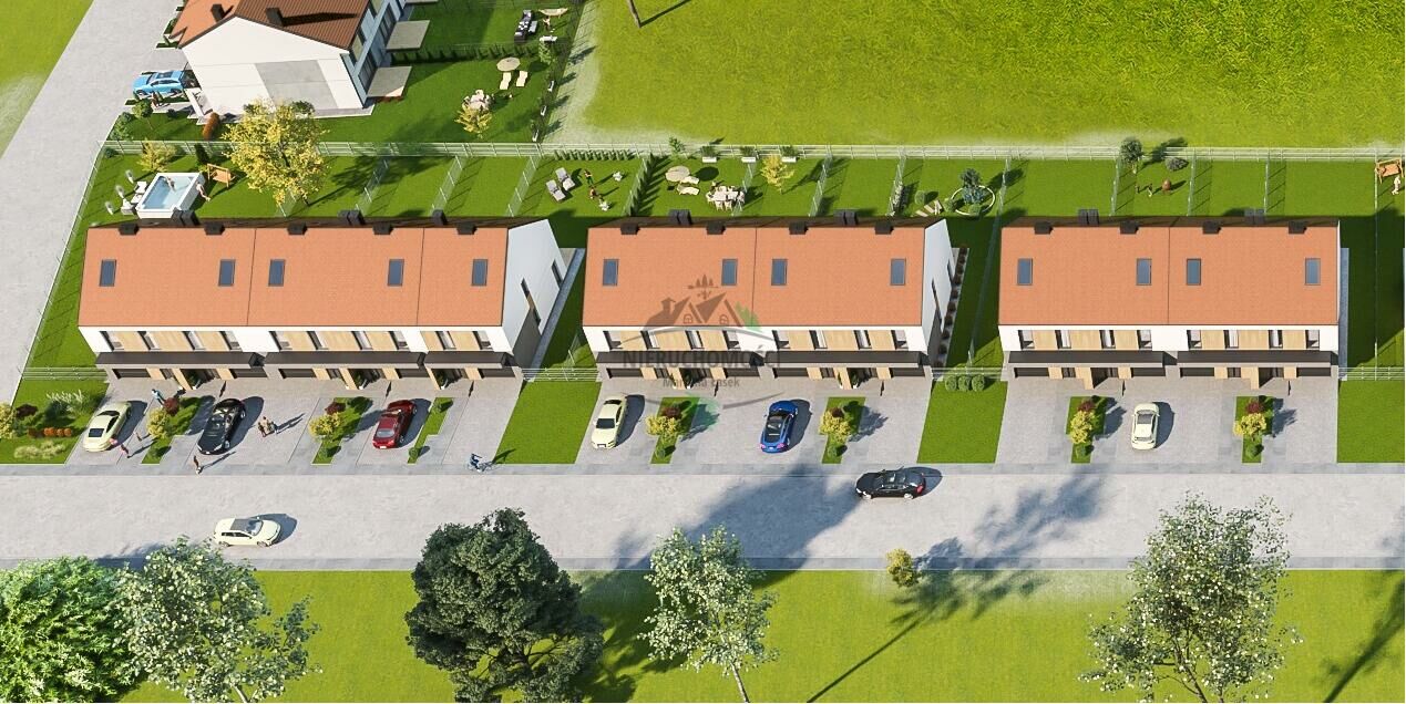 Inwestycja oferuje domy w zabudowie szeregowej z własnymi dużymi ogrodami. Wielkie okna oraz ustawienie domów na działce, zapewniają doskonałe doświetlenie w części dziennej, stanowiącej jednocześnie wyjście do ogrodu. Do każdego domu prowadzi długi podjazd.